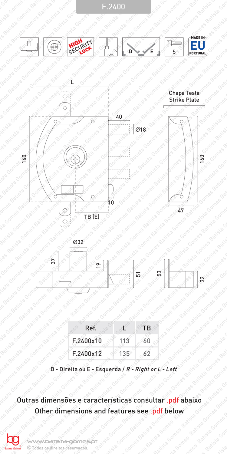 Dimensões caixa F.2400x10 - 113x160mm F.2400x12 - 135x160mm