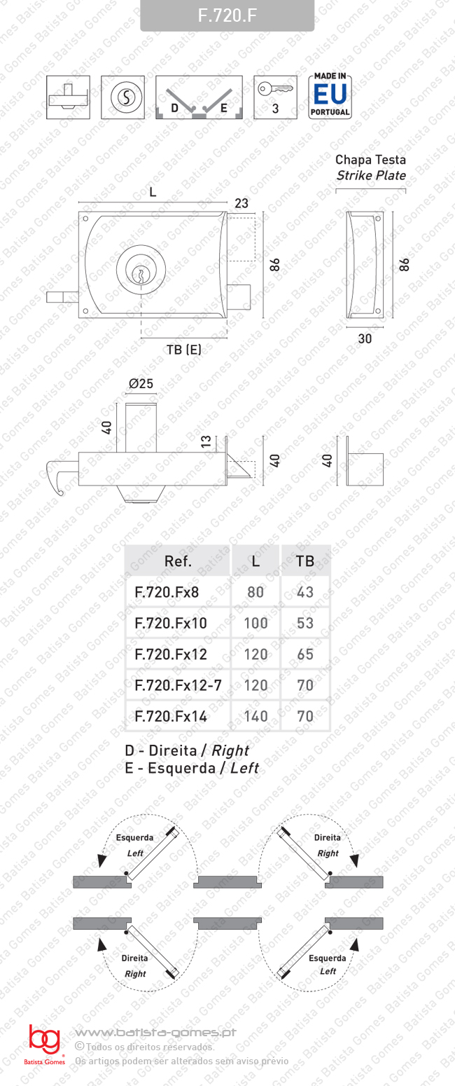 F.720.F FECHADURA SOBREPÔR "Tipo Yall"Dimensões caixa F.720.Fx8 - 80mm F.720.Fx10 - 100mm F.720.Fx12 - 120mm F.720.Fx12-7 - 120mm F.720.Fx14 - 140mm Indicar portas direita (D) ou esquerda (E) • Fechadura sobrepôr com trinco e língua deslizante • O trinco recolhe no interior pelo puxador do trinco e no exterior pelo cilindro A língua é accionada pelo cilindro em ambos os lados • Cilindro fixo em latão • Com 3 chaves • Caixa em aço pintado castanho claro / Língua, trinco e puxador de trinco em Zamac Para mais informação consultar desenho técnico.