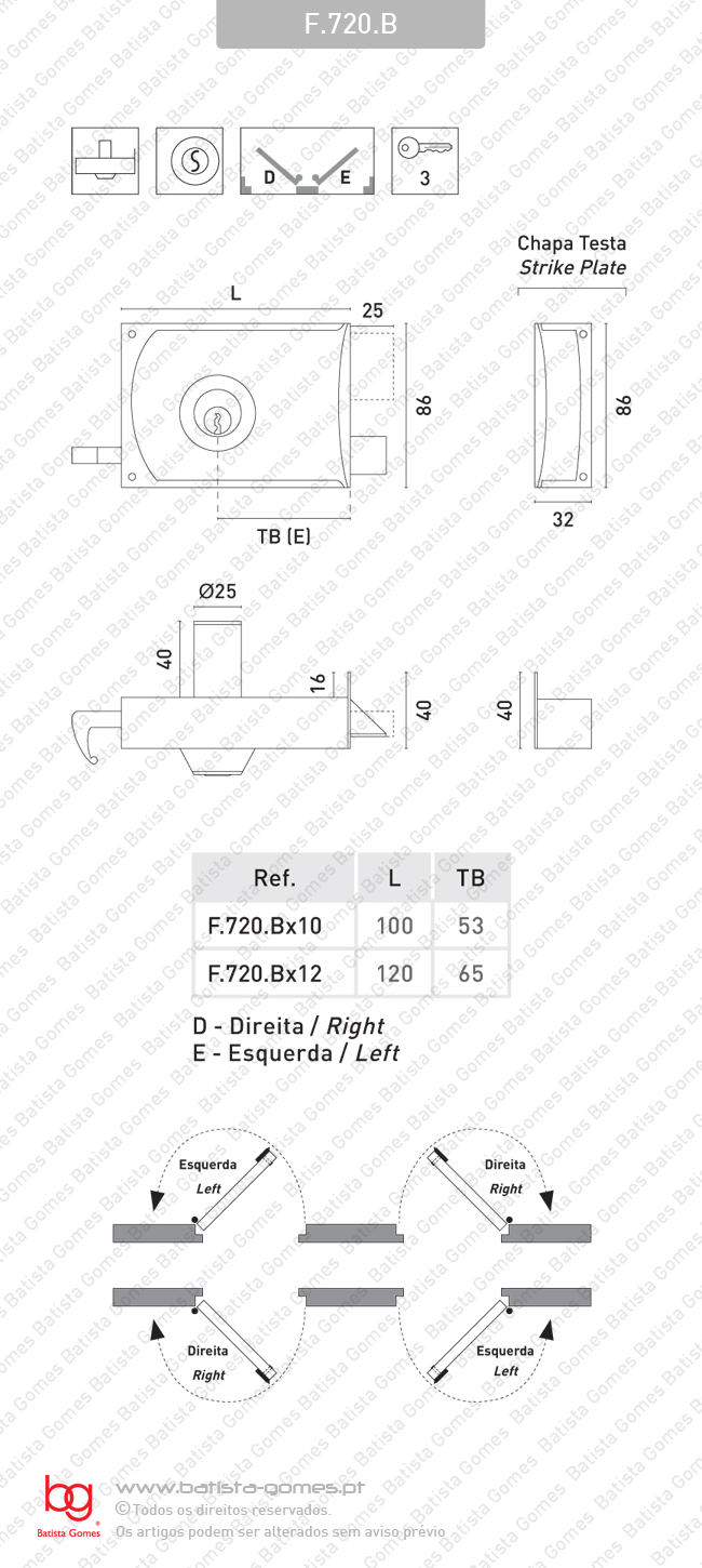 Indicar portas direita (D) ou esquerda (E) • Fechadura sobrepôr com trinco e língua deslizante • O trinco recolhe no interior pelo puxador do trinco e no exterior pelo cilindro A língua é accionada pelo cilindro em ambos os lados • Cilindro fixo • Com 3 chaves • Caixa em aço pintado castanho / Metais dourado satinado Para mais informação consultar desenho técnico.