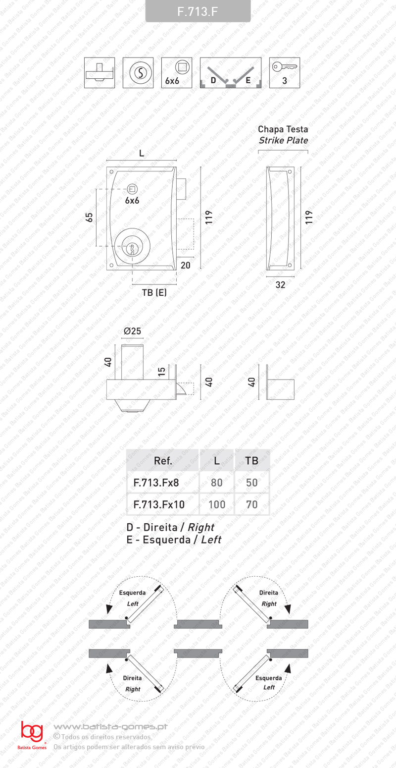 F.713.F FECHADURA SOBREPÔR COM CILINDRO E QUADRADimensões caixa F.713.Fx8 - 80mm F.713.Fx10 - 100mm Indicar portas direita (D) ou esquerda (E) • Fechadura sobrepôr com trinco e língua deslizante • Com cilindro e quadra para puxadores • O trinco é accionado pelo puxador e a língua pela chave do cilindro • Cilindro fixo em latão • Com 3 chaves • Caixa em aço pintado • Cilindro exterior/interior em latão polido satinado Para mais informação consultar desenho técnico.
