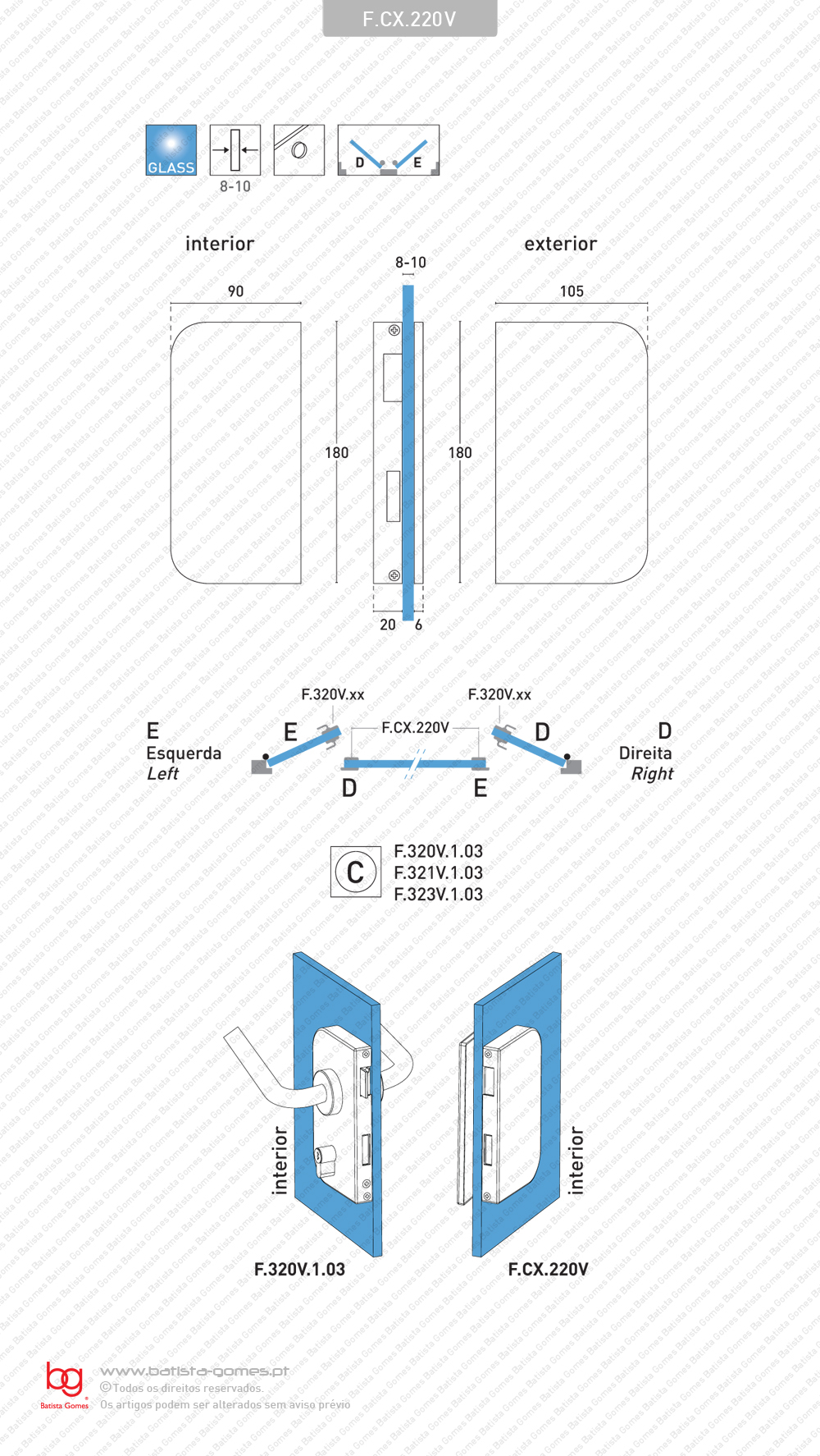 Batista Gomes, Lda.  F.CX.220V - Caixa / Chapa testa para folha oposta em vidro compatível com fechaduras série F.320V - F.321V - F.323V