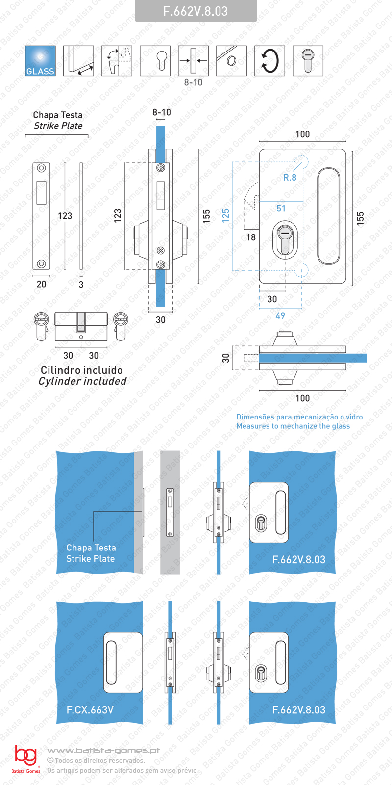 - Espessura vidro: 8 a 10mm - Gancho recolhível, accionado pela chave no cilindro - Cilindro de segurança perfil europeu 30+30mm com 5 chaves - Este cilindro não permite amestragens