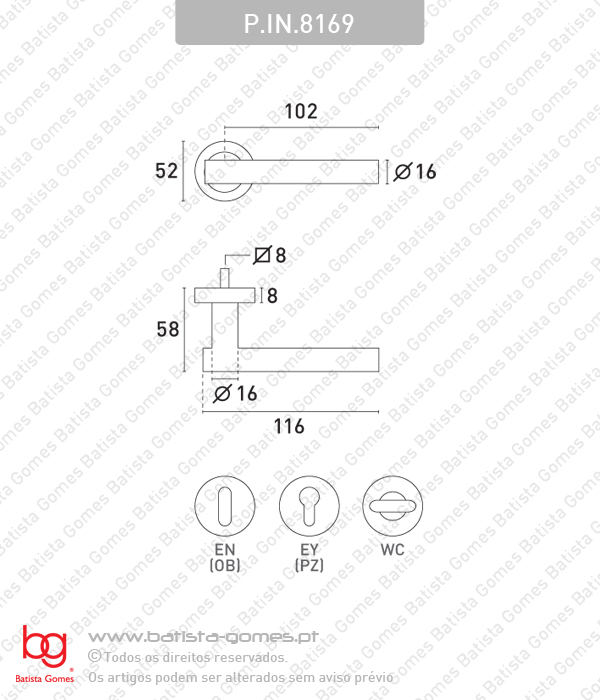 P.IN.8169 • Par Puxador • Inclui entradas de chave normal (EN) ou para cilindro (EY) • Rosetas cobertura inox com bases interiores metálicas • Molas de recuperação • Muleta fixa à roseta • Fixação oculta por parafusos e carrapeta a atravessar a porta + perno roscado nas muletas