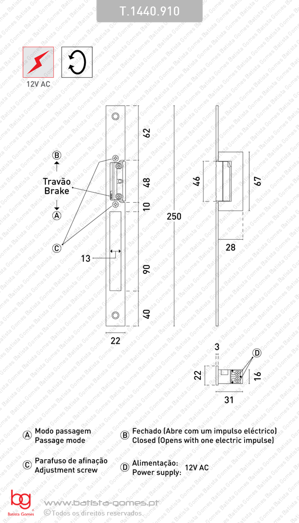 • Abertura / desbloqueio com um único impulso ( contacto eléctrico ) • A porta volta a ficar fechada, só quando efectuarmos movimento específico para o efeito • Desactivando o travão funciona no modo de passagem • Alimentação: 12V AC • Consumo: 15W • Para perfil com canal europeu • Trinco eléctrico à face da testa (não sobressai ) • ISEO Para mais informações consultar desenho técnico