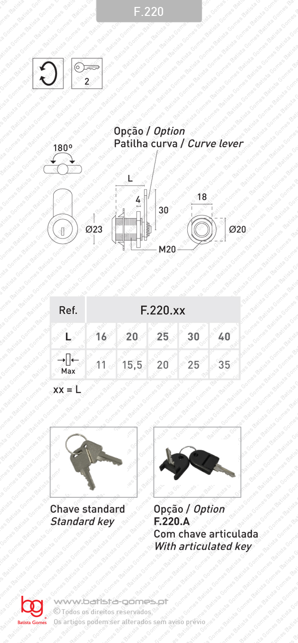 • Cilindro com 2 chaves • Fornecimento normal: patilha direita • Sob-consulta poderá ser fornecida com patilhas quinadas