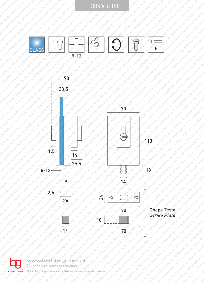Características: Espessura vidro: 8 a 12mm Reversível, para portas direitas e esquerdas Com cilindro segurança perfil europeu 35+35