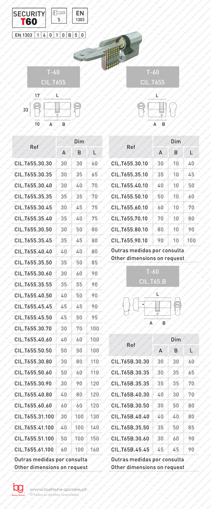 CILINDROS SEGURANÇA PERFIL EUROPEU Série T-60 - TESA CIL.T655 - Chave / Chave CIL.T655 - Chave / Cego CIL.T65.B - Botão / Chave