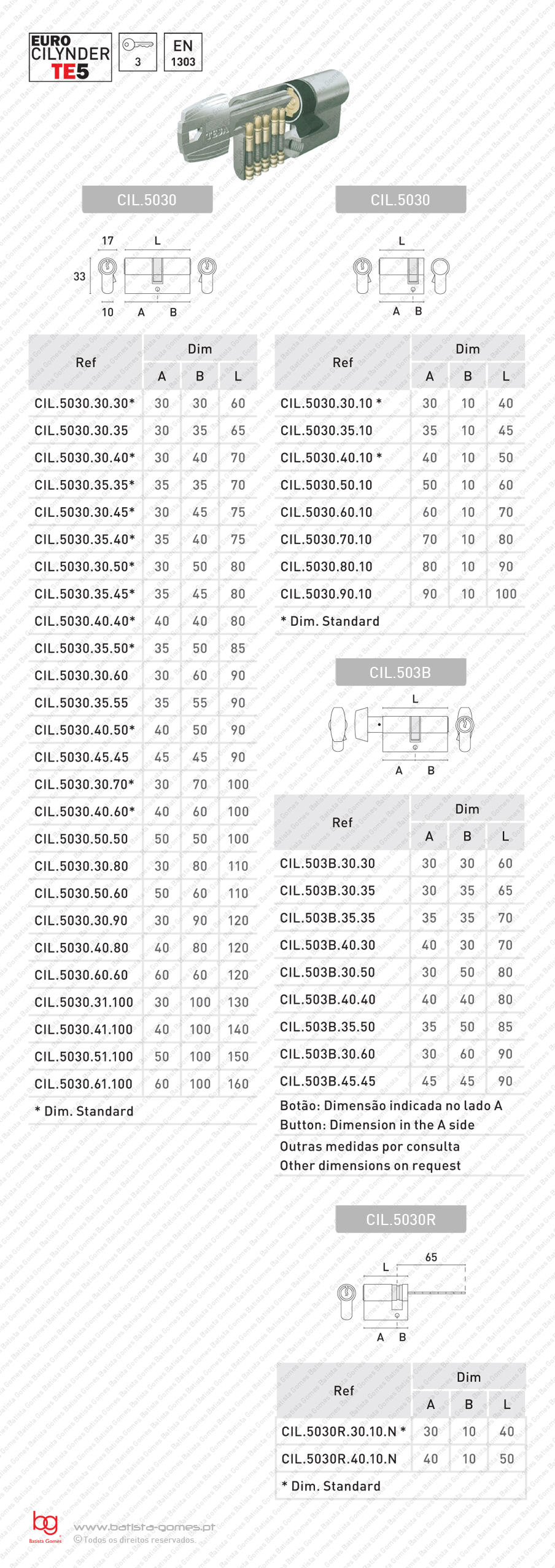 Batista Gomes, Lda.  CIL.5030; CIL.503.B; CIL.5030.R -TE5 - Cilindro perfil europeu TE5 - Chave / Chave; Chave / Cego; Botão / Chave; Chave / Palhetão - TESA