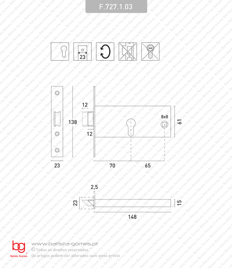 TB ( Entrada ): 70 / 135mm Quadra: 8mm Trinco reversível • Fechadura embutir (almofada) para portas em alumínio • Cilindro não incluído • Possibilidade de fornecimento com cilindros de outras dimensões, com chaves iguais ou amestrados • Trinco accionado pelo puxador ou pela chave. Bloqueia com a chave • Caixa em aço lacado e testa nos acabamentos abaixo indicados