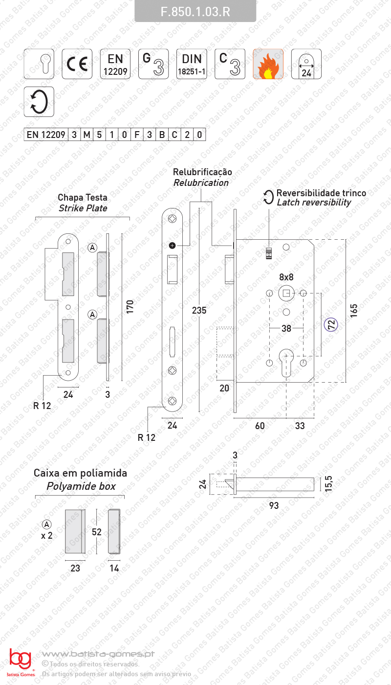 F.850.1.03.R - Testa cantos redondos FECHADURA EMBUTIR PARA CILINDRO EUROPEU Grau 3 / Utilização elevada EN 12209 Certificação CE Classe 3 ( DIN 18251-1 )