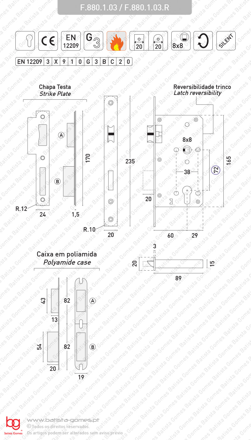 F.880.1.03 - Testa cantos rectos F.880.1.03.R - Testa cantos redondos FECHADURA EMBUTIR PARA CILINDRO EUROPEU