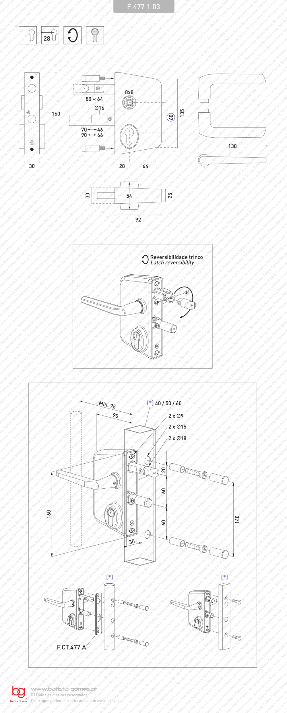 F.477.1.03 Com trinco reversível e língua reguláveis Para cilíndro europeu Par puxador + cilíndro incluídos Inoxidável Fechadura para portas exteriores metálicas com trinco e língua redondas reguláveis. Aplicável com perfil quadrado, rectangular ou redondo de 40 / 50 / 60mm. Completa com par puxador e cilíndro incluído. Inoxidável (fabricada em alumínio e latão) F.CT.477.A Chapa testa/placa para montagem em tubo redondo