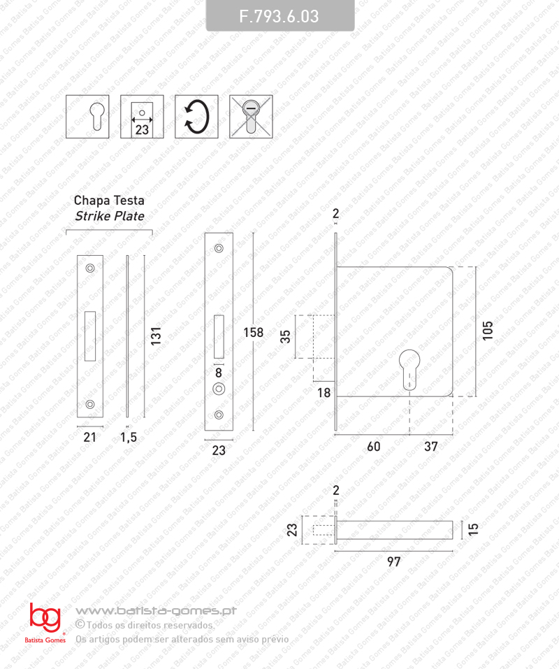 F.793.6.03 - Testa cantos rectos FECHADURA EMBUTIR PARA CILINDRO EUROPEU COM LÍNGUA - SEM TRINCO Grau 2 / Utilização média TB ( Entrada ): 60mm • Fechadura embutir para portas com língua deslizante • Cilindro não incluído • Testa e chapa testa nos acabamentos abaixo indicados