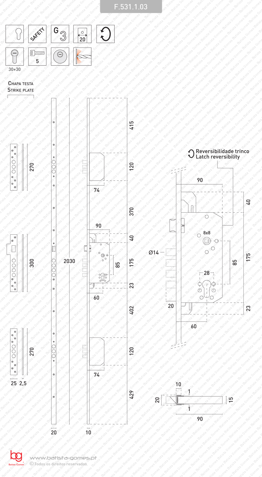 TB ( Entrada ): 60mm Quadra: 8mm Distância quadra / cilindro: 85mm Trinco reversível 4+3+3 línguas redondas em aço cromado Escudo segurança integral E 700L Altura testa: 2030 Testa e chapas testa nos acabamentos abaixo indicados Cilindro segurança TESA T60 / 30+30 incluído. Outras dimensões por pedido • Fechadura alta segurança de embutir para portas exteriores • Funciona com cilindros de perfil europeu segurança ou normais. Possibilidade de fornecimento com cilindros de várias dimensões, com chaves iguais ou amestrados. • Escudo protector segurança exterior ES E700L em aço anti-broca com cobertura latão, protegendo integralmente o cilindro e com anilhas compensatórias para ajustar à dimensão do mesmo e espelho interior em latão niquel mate ou polido satinado. • Com testa e chapas testas em aço inox satinado ou dourado satinado (esmaltado)