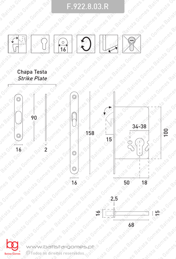 F.922.8.03.R - Testa cantos redondos FECHADURA EMBUTIR COM GANCHO RECOLHÍVEL PARA CILINDRO EUROPEU TB ( Entrada ): 50mm • Fechadura embutir com gancho recolhível para cilindro europeu • Indicado para portas de correr • O gancho é accionado pelo cilindro. Na posição de porta aberta o gancho encontra-se totalmente recolhido dentro da fechadura • Cilindro não incluído • Possibilidade de fornecimento com cilindros de várias dimensões, com chaves iguais ou amestrados • Testa e chapa testa nos acabamentos abaixo indicados Para mais informações consultar desenho técnico Cilindros perfil europeu: Consultar sub-família cilindros ou clique aqui
