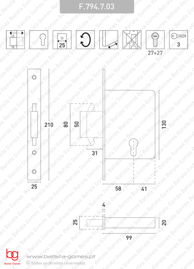 F.794.7.03 - Testa cantos rectos FECHADURA EMBUTIR COM LÍNGUA FORTE DE GARRAS PARA CILINDRO EUROPEU TB ( Entrada ): 60mm • Fechadura embutir com língua forte deslizante de garras para cilindro europeu • Indicada para portas de correr • Ao fechar a língua desliza e acciona as garras na 2ª volta de chave. Na posição de porta aberta a língua encontra-se totalmente recolhida dentro da fechadura • Cilindro europeu 27+27 incluído • Possibilidade de fornecimento com cilindros de várias dimensões, com chaves iguais ou amestrados • Testa e chapa testa nos acabamentos abaixo indicados Para mais informações consultar desenho técnico Cilindros perfil europeu: Consultar sub-família cilindros ou clique aqui
