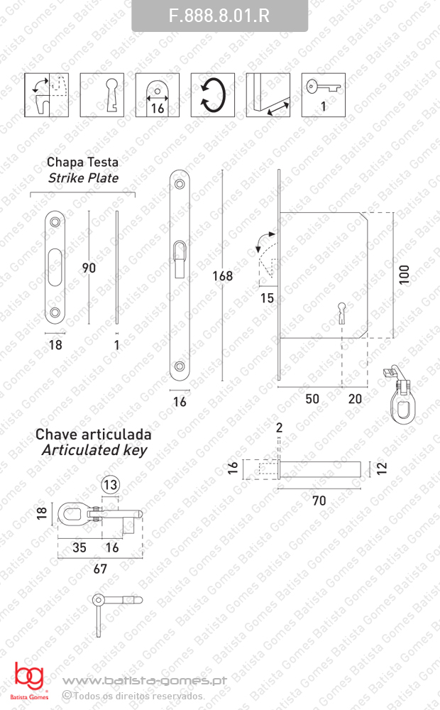 TB ( Entrada ): 50mm Sem quadra 1 chave articulada • Fechadura de embutir com gancho recolhível • Indicada para portas de correr • O gancho é accionado pela chave. Bloqueia / desbloqueia com a chave • Testa e chapa testa nos acabamentos abaixo indicados Devido à dimensão da chave a espessura máxima da porta não deve ultrapassar os 35mm