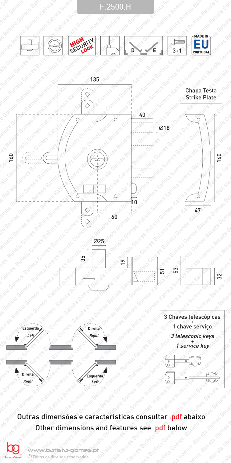 F.2500.AZ.H FECHADURA ALTA SEGURANÇA DE SOBREPÔR Com trancas H extensiveis Direita ou Esquerda• Guia exterior para chave (sem cilindro exterior) • Com reforço segurança anti-broca e anti-gazua • Testa à broca 60mm • Dimensões da caixa: 135x160mm • Com trancas H extensíveis • Tranca em 5 pontos • 3 chaves telescópicas com 4 voltas de chave + 1 chave serviço que acciona só 2 voltas • 3 línguas redondas + trinco em aço calibrado cromado Acabamentos: Caixa e trancas + Cilindro interior, puxador trinco e espelho exterior LCB - Aço Lacado Castanho + Latão Cromado Brilhante Opções: LPS - Aço Lacado Castanho + Latão Polido Satinado LB - Aço Lacado Castanho + Latão Bronze Para mais informação consultar desenho técnico. Outras opções - consultar "Veja também" F.2500.AZ