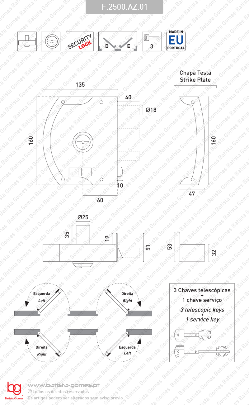 F.2500.AZ.01 FECHADURA SEGURANÇA DE SOBREPÔR Direita ou Esquerda