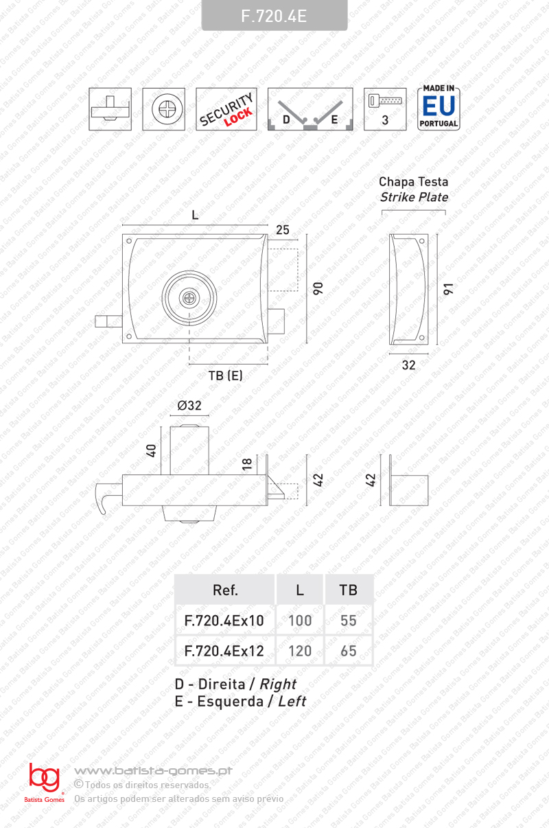 F.720.4E FECHADURA SEGURANÇA SOBREPÔR Com cilindro 4 entradas Dimensões caixa F.720.4Ex10 - 100mm F.720.4Ex12 - 120mm