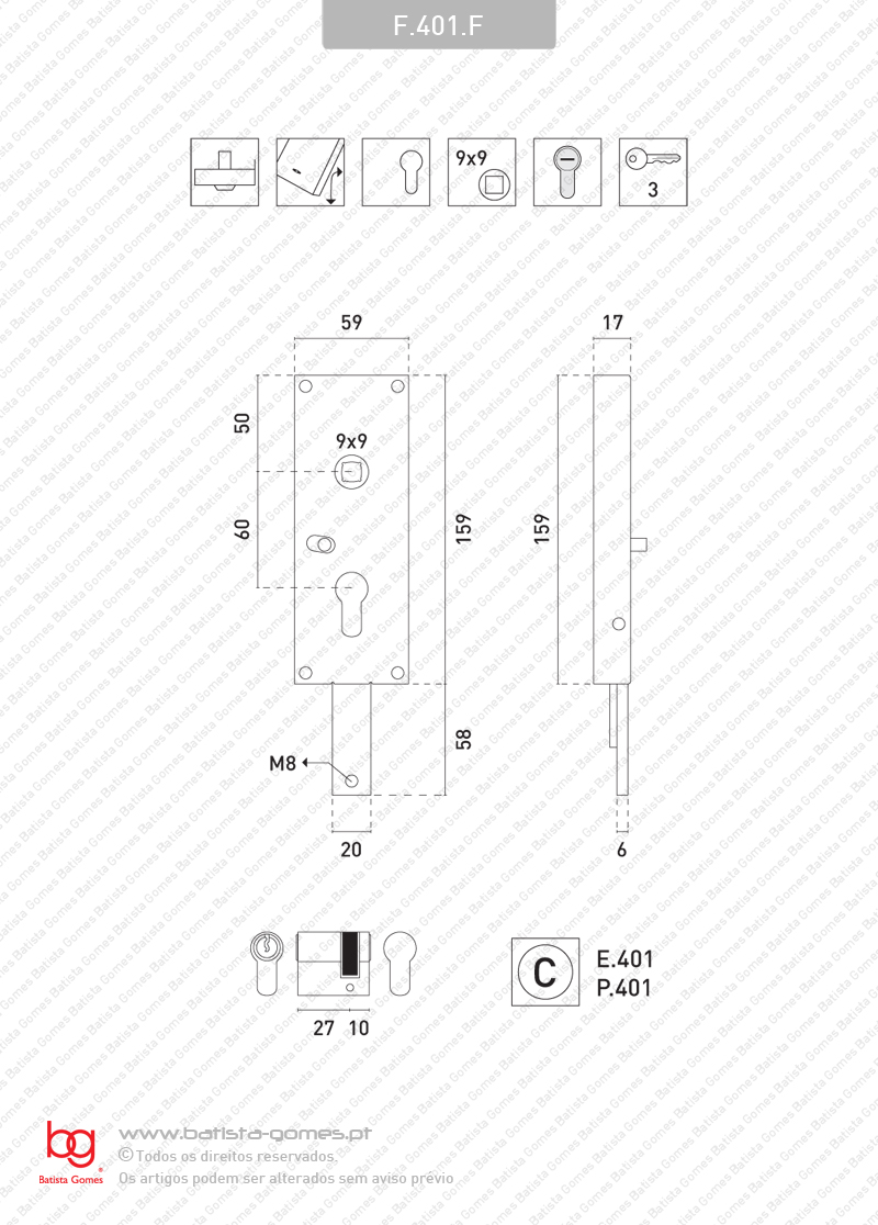 F.401.F FECHADURA PARA PORTÕES BASCULANTESChave exterior Com meio cilindro europeu "Jval" 27+10 Bloqueia / desbloqueia com cilindro Fecha / abre com puxador Quadra 9x9mm Caixa em aço zincado