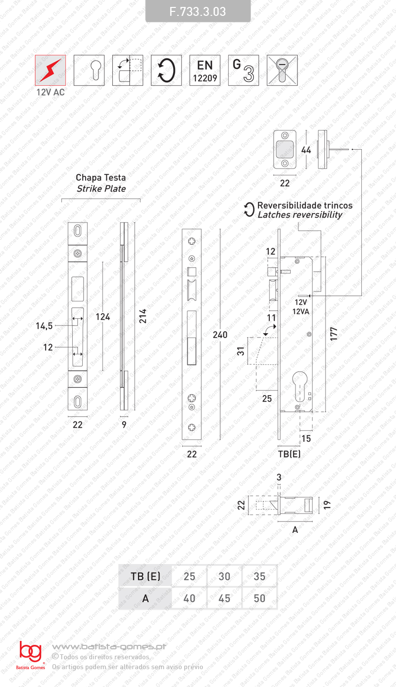 TB ( Entrada ): 25 / 30 / 35mm Trincos reversíveis e língua basculante Certificação: EN 12209 / Grau 3