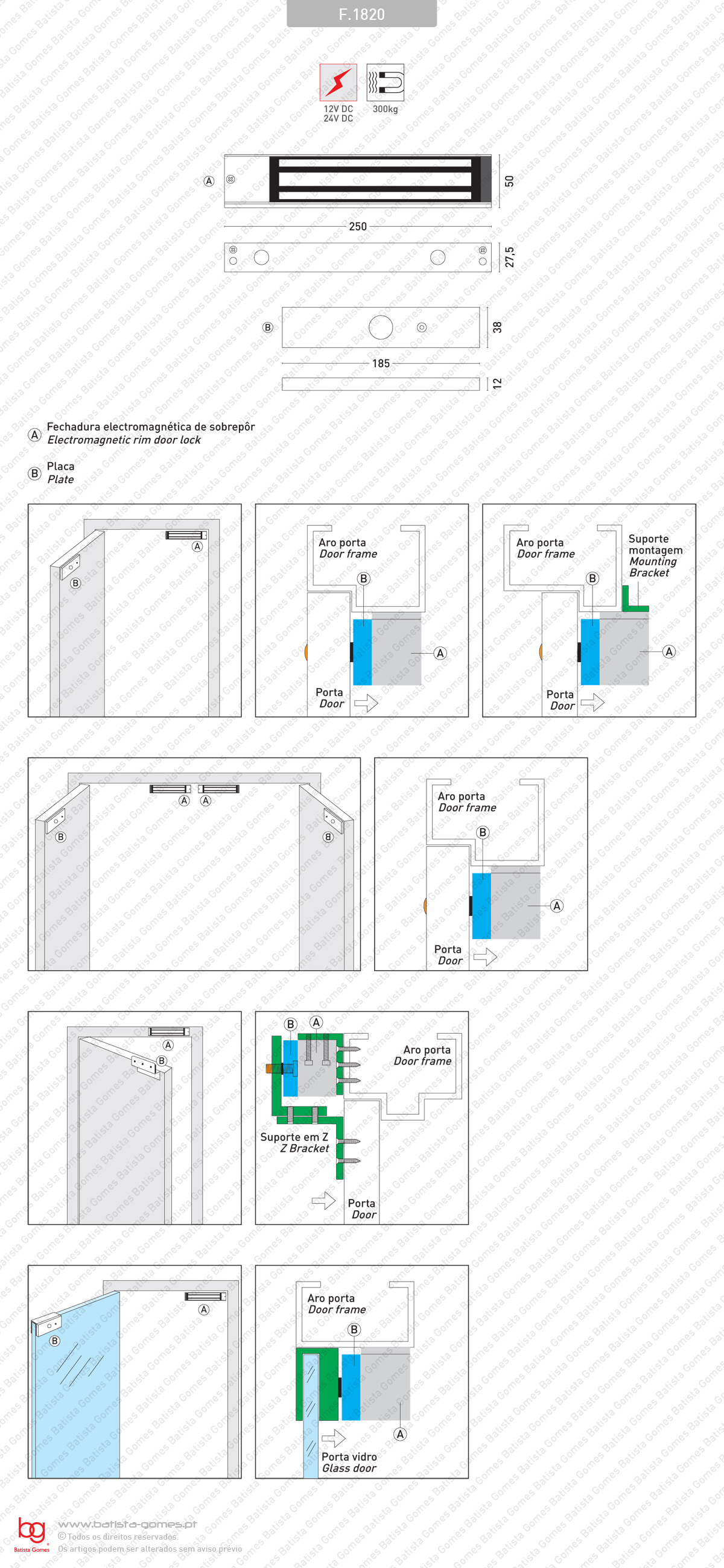 F.1820 FECHADURA ELECTROMAGNÉTICA DE SOBREPORResistência: 300kg Alimentação: 12V DC / Consumo: 500mA Alimentação: 24V DC / Consumo: 250mA Peso: 2kg • Led detector presença e posição da porta ( aberta / fechada )