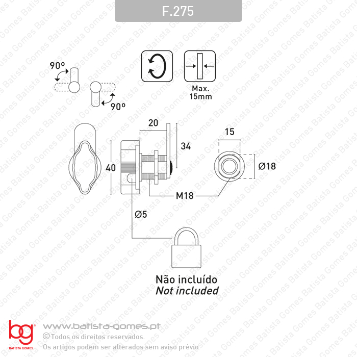 • Ambidextra: Para portas direitas ou esquerdas • Altera de esquerda para direita e vice-versa, rodando o cilindro e a posição da patilha. • Rotação da patilha: 0º a 90º • Para aplicação com cadeado em portas de armários / cacifos • Cadeado não incluído, fornecido em separado