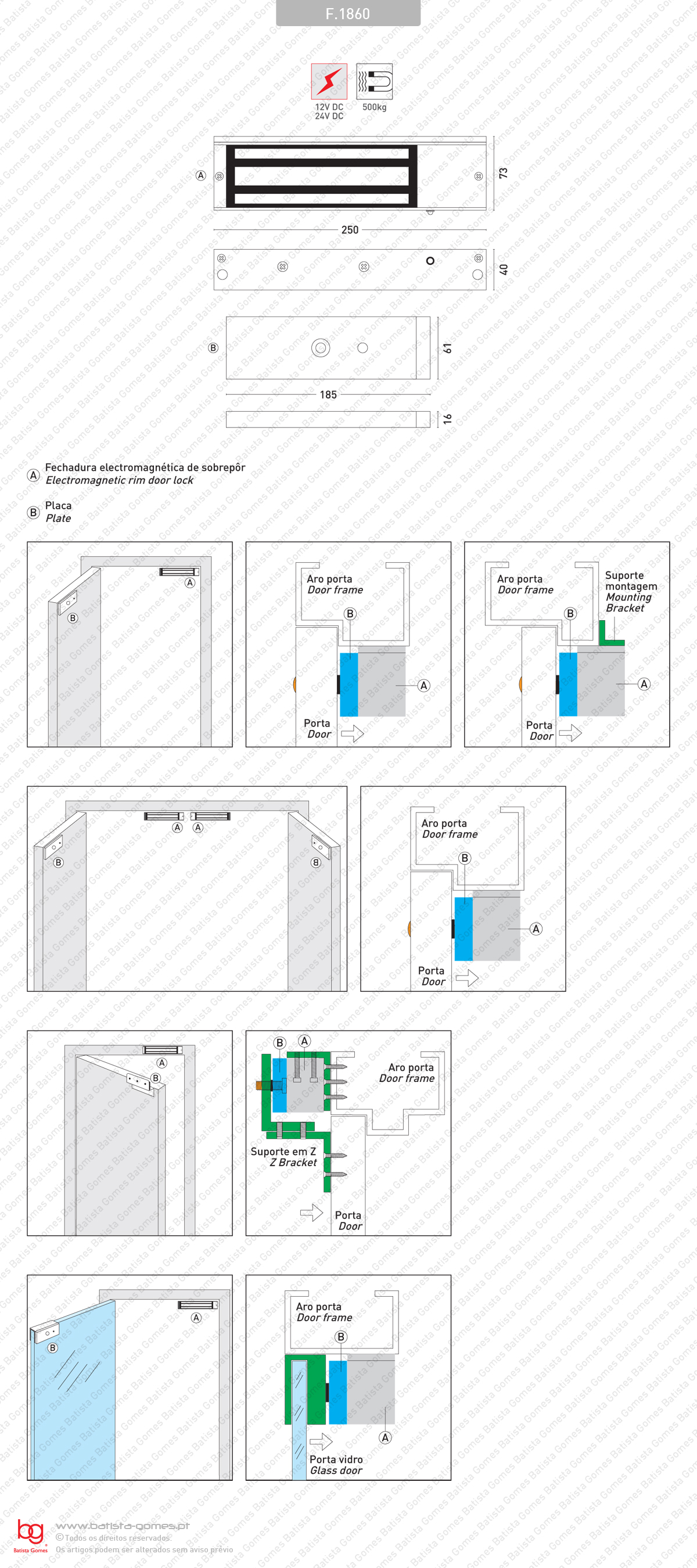 Resistência: 500kg Alimentação: 12V DC / Consumo: 500mA Alimentação: 24V DC / Consumo: 250mA Peso: 4,3kg Dimensões: 250x73x40mm