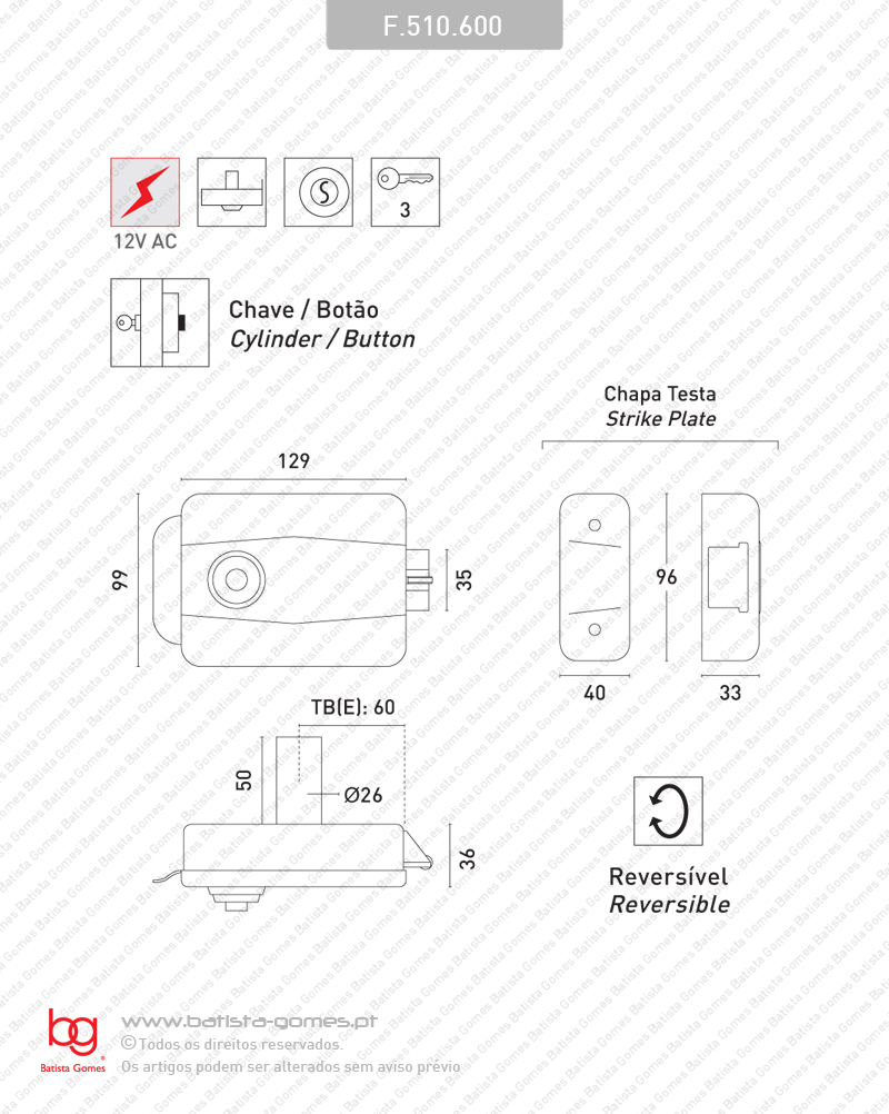F.510.600 FECHADURA ELÉCTRICA DE SOBREPOR CHAVE / BOTÃO O trinco é accionado no interior pelo botão e no exterior pelo cilindro