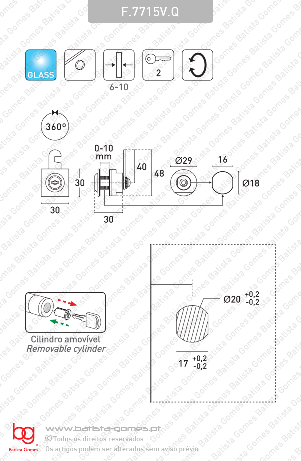 Batista Gomes, Lda.  F.7715V.Q - Fechadura com cilindro para armários - Portas em vidro