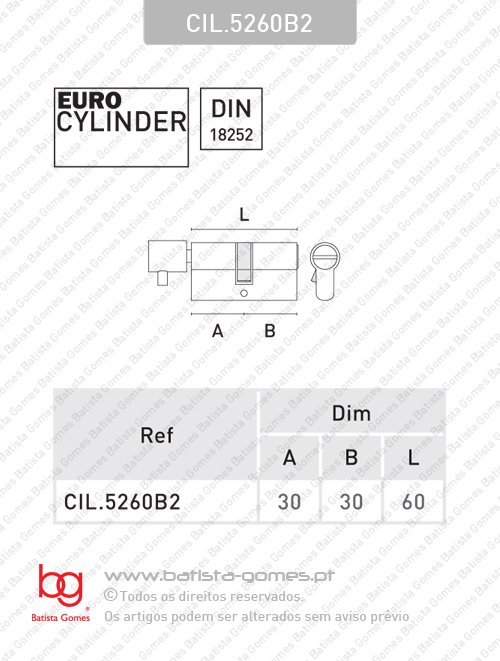 Batista Gomes, Lda.  CIL.5260B2 - Cilindro perfil europeu - Botão / Fenda
