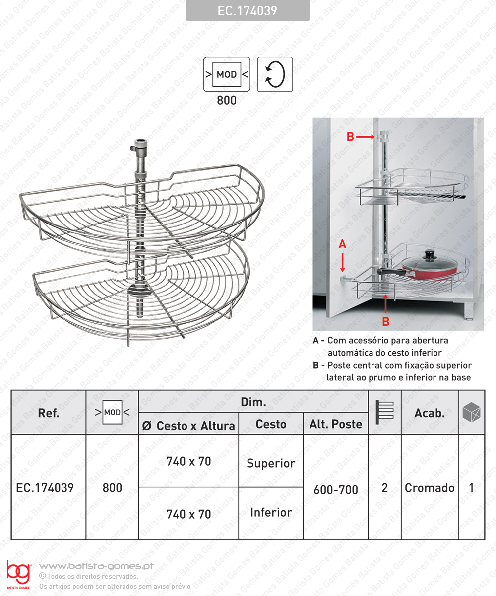 EC.174039 PRATELEIRAS GIRATÓRIAS 180º (2/4) - Meia Lua • Prateleiras giratórias para móveis de cozinha 180º (2/4) • Distância entre prateleiras ajustável • Poste central com fixação superior lateral ao prumo e inferior na base • Com acessório para abertura automática do cesto inferior • Cestos em cromado (superior + inferior)