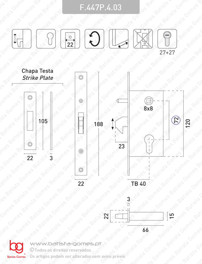F.447P.4.03 - Testa cantos rectos FECHADURA EMBUTIR COM GANCHO FORTE PARA CILINDRO EUROPEU TB ( Entrada ): 40mm Quadra: 8mm ( 6mm com redutor ) Distância quadra / cilindro: 72mm• Fechadura embutir com gancho oscilante não recolhível para portas de correr • O gancho é accionado pelo puxador ou cilindro. Bloqueia com o cilindro • Com cilindro europeu 27+27 incluído • Possibilidade de fornecimento com cilindros de várias dimensões, com chaves iguais ou amestrados • Testa e chapa testa nos acabamentos abaixo indicados Para mais informações consultar desenho técnico Cilindros perfil europeu: Consultar sub-família cilindros ou clique aqui