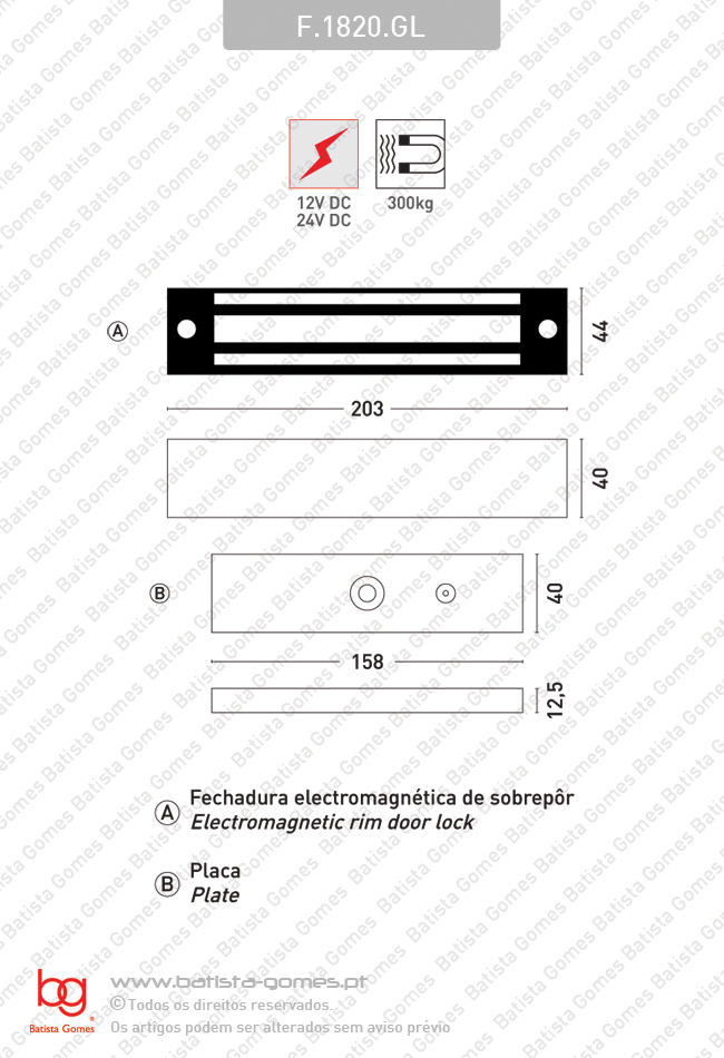 Resistência: 300kgAlimentação: 12V DC / Consumo: 500mAAlimentação: 24V DC / Consumo: 250mAPeso: 1,5kg