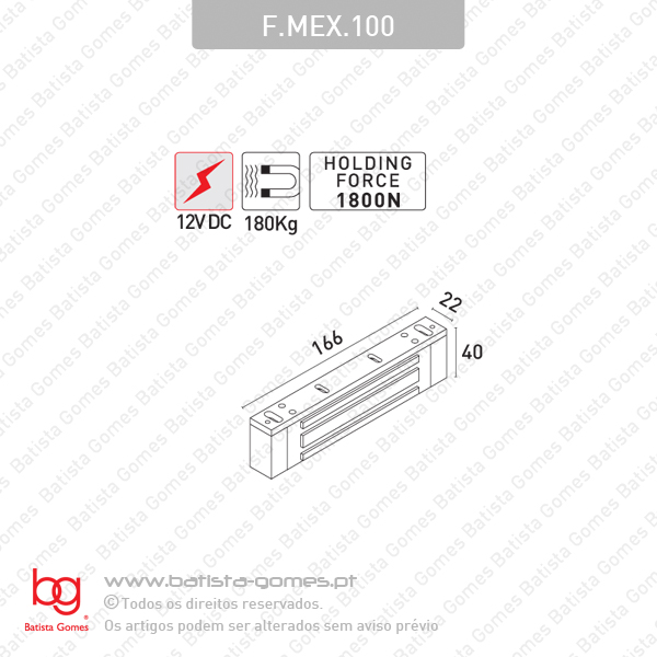• Resistência: 1800N / 180kg• Consumo: 250mA / 12V DC• Peso: 1,2kg• Dim: 166x40x22mm
