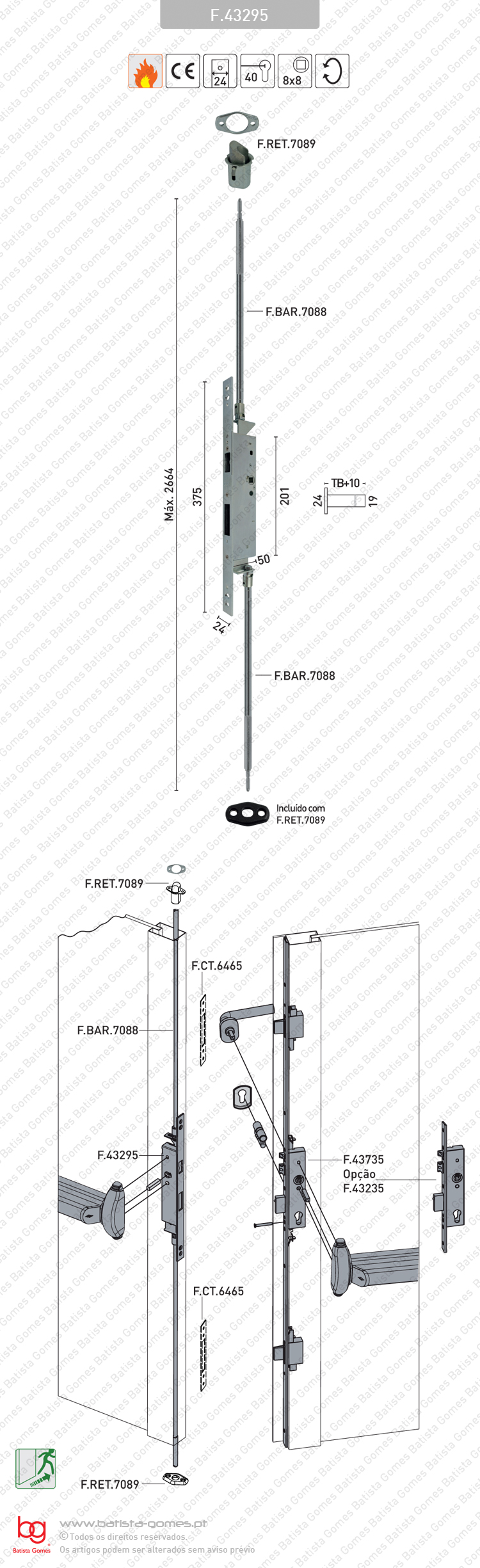 • Testa: 375x24x3mm • Caixa: 201x50x19mm • Aplicação standard: Folha passiva em porta de 2 folhas com fechaduras F.43235 ou F.43735 • Varetas ajustáveis na horizontal (18mm) • Impulsionador da língua regulável 5.5mm • Restabelecimento do fecho das varetas automático ou manual