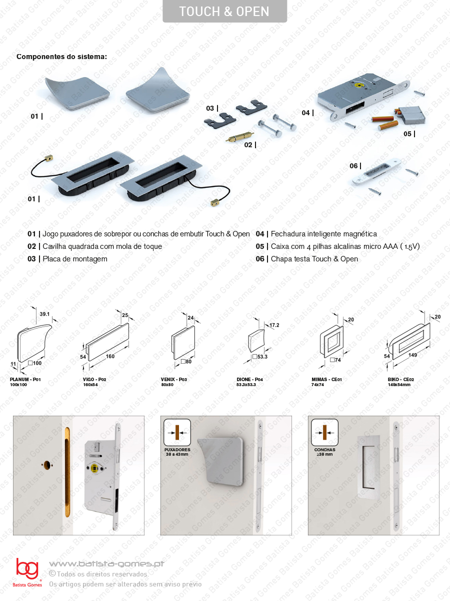 O SISTEMA TOUCH & OPEN ALTERA O CONCEITO DA FORMA COMO SE ABRE UMA PORTA O sistema Touch & Open significa que a fechadura desbloqueia através de um simples toque no puxador. Fecha pela acção magnética do trinco. Touch & Open é uma solução impressionante, táctil e funcional, para os que preferem um design minimalista. Os puxadores de sobrepor ou de embutir, caracterizam-se pelas suas formas geométricas. Não contêm componentes móveis ou mecânicos. Vantagens e Benefícios: • A rotação normal do puxador da porta deixa de ser necessária, funciona com toque no puxador • Não necessita de chave • O puxador pode ser substituído por outro da coleção Touch & Open • Instalação rápida • Trinco magnético. Não bate no aro • Chapa testa minimalista com caixa de embutir • Não desgasta nem exige manutenção; funcionamento suave sem necessidade de lubrificação adicional. • Facilidade de utilização. A funcionalidade táctil não exige qualquer reconhecimento digital do utilizador. • Promove uma simbiose perfeita entre a funcionalidade e o design minimalista, em espaços habitacionais ou de serviços. Fácil utilização, inclusive para crianças, idosos e pessoas com capacidade de manipulação reduzida O sistema é fornecido com: • 1 fechadura magnética com tecnologia Touch & Open de embutir com material de fixação • 1 chapa testa plana com caixa de embutir e contacto magnético • 1 quadra com mola de contacto Touch & Open (versão puxador) • 1 alojamento de bateria com 4 pilhas AAA • 1 jogo de puxadores ou conchas de embutir Touch & Open Para mais informações consultar .PDF abaixo