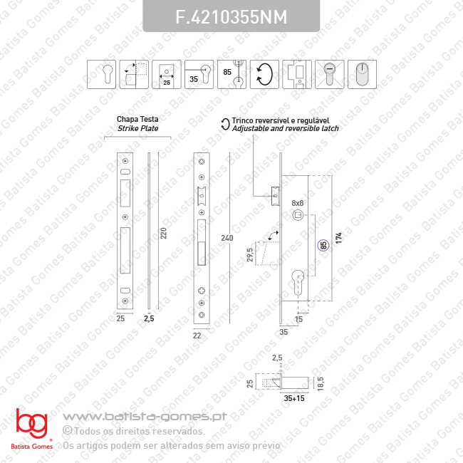 • Para caixilharia metálica/ alumínio • Língua basculante • TB = 35mm • Trinco reversível com afinação • Trinco recolhe pelo puxador ou cilindro • Língua basculante accionada pelo cilindro • Testa e chapa testaem inox satinado • Cilindro não incluído • Escudo segurança E210 incluído