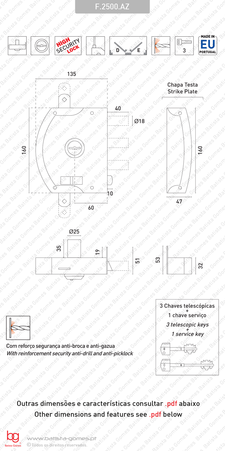 F.2500.AZ FECHADURA ALTA SEGURANÇA DE SOBREPÔR Para trancas verticais Direita ou Esquerda• Guia exterior para chave (sem cilindro exterior) • Com reforço segurança anti-broca e anti-gazua • Testa à broca 60mm • Dimensões da caixa: 135x160mm • Para trancas verticais extensíveis (fornecidas em separado- JG.TR.51) • Tranca em 3 pontos • 3 chaves telescópicas com 4 voltas de chave + 1 chave serviço que acciona só 2 voltas • 3 línguas redondas + trinco em aço calibrado cromado Acabamentos: Caixa e trancas + Cilindro interior, puxador trinco e espelho exterior